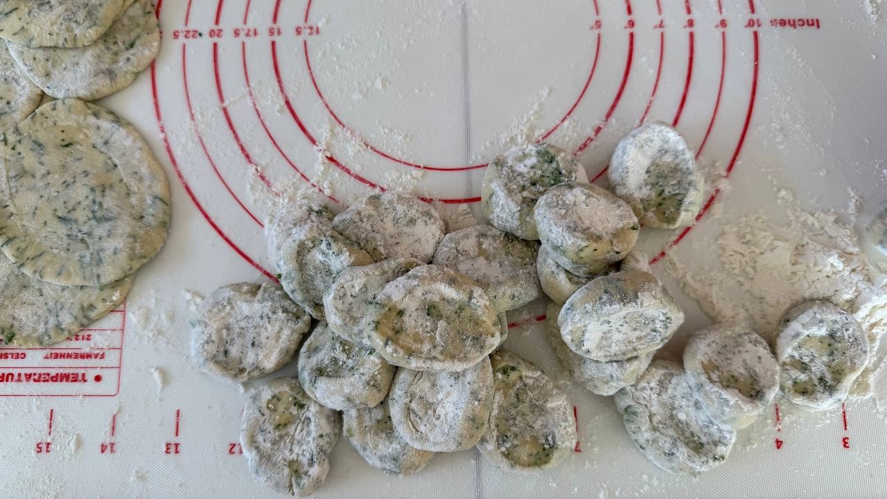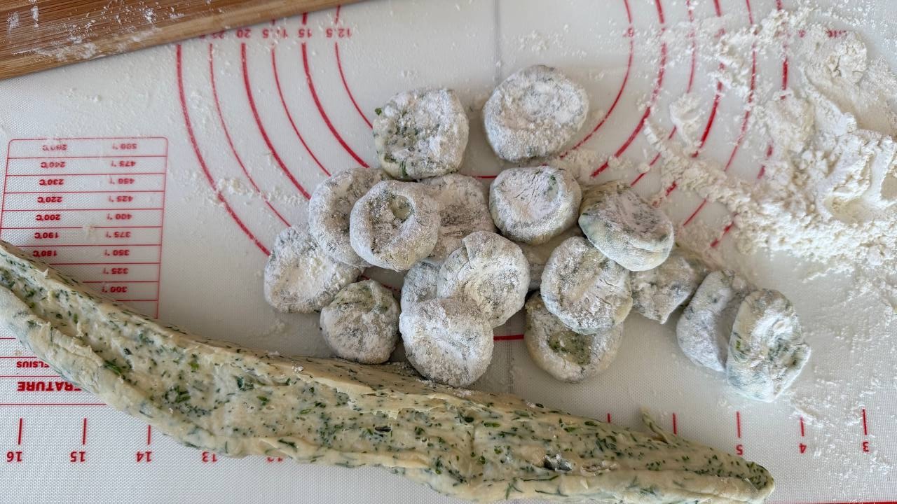 Мелко нарезать укроп и добавить в тесто. Вымесить до гладкой, эластичной консистенции. При необходимости добавить немного муки. Дать тесту отдохнуть 10–15 минут.