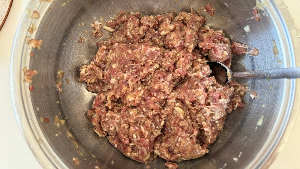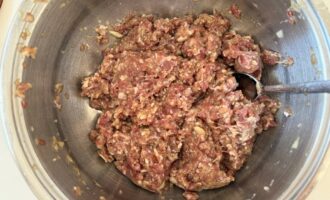 В отдельной миске взбить яйца вилкой и добавить к фаршу.