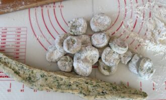 Придать тесту форму колбаски и нарезать на равные кусочки.