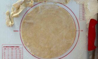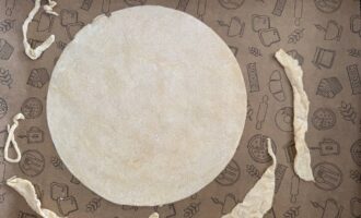 • Положить первый шарик на присыпанную мукой поверхность и раскатать очень тонко, не больше 1–2 мм. Диаметр коржа должен получиться около 23-25 см.
