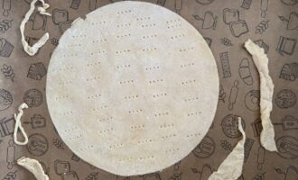 • Поскольку готовые коржи будет очень сложно обрезать, лучше это сделать до выпекания. Положите тарелку или крышку нужного диаметра на корж и надавите, чтобы остался отпечаток. Затем срежьте лишнее ножом. Обрезки не выбрасывайте, мы их будем использовать для украшения торта.