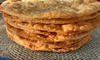 • Готовый корж при помощи лопатки переложить на плоскую тарелку. Перекладывайте аккуратно, коржи очень хрупкие! Аналогичным образом приготовьте коржи из остального теста.