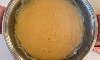 • Сразу накрыть крем пищевой плёнкой в контакт с кремом. Это важно, иначе заварной крем быстро заветрится и сверху образуется корочка, которая не подойдет для сборки торта.