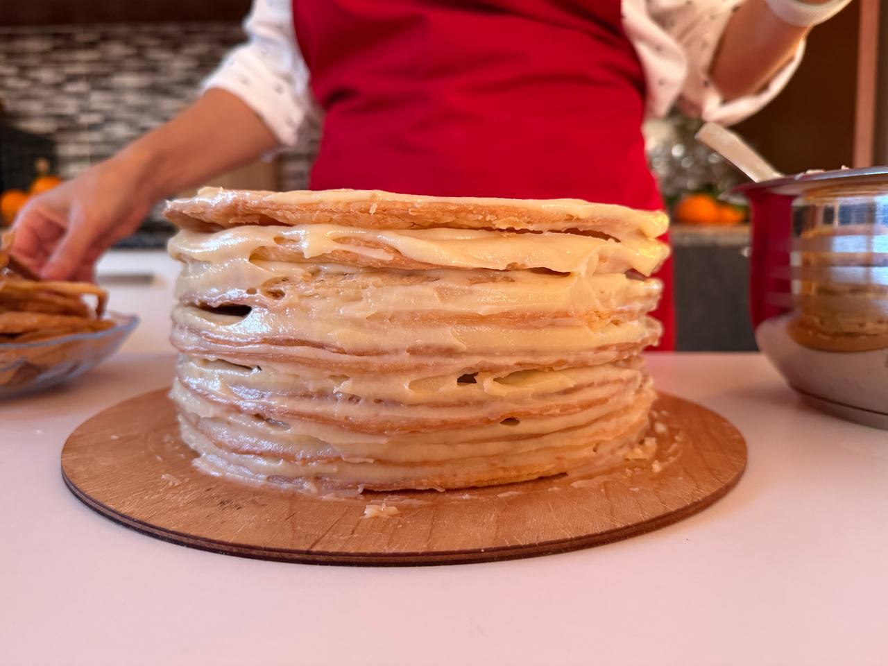 • Третий корж положить гладкой стороной вниз и также промазать кремом. Дальше продолжить выкладывать коржи, чередуя стороны. Это нужно для того, чтобы Наполеон получился более ровным, а между коржами не оставалось ненужного воздушного пространства. Сверху должна оказаться гладкая сторона.