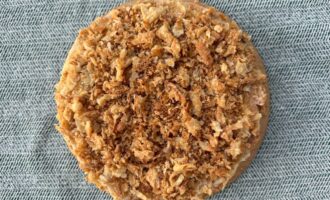 • Готовый корж переложить на пергамент, обрезки разложить вокруг коржа. Выпекать в течение 10 минут на режиме верх/низ, без конвекции, на средней полке, до золотистого цвета.