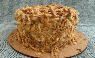• Обсыпать торт Наполеон со всех крошкой, она будет легко прилипать к заварному крему. По желанию можно дополнительно украсить Наполеон ягодами или другим декором.