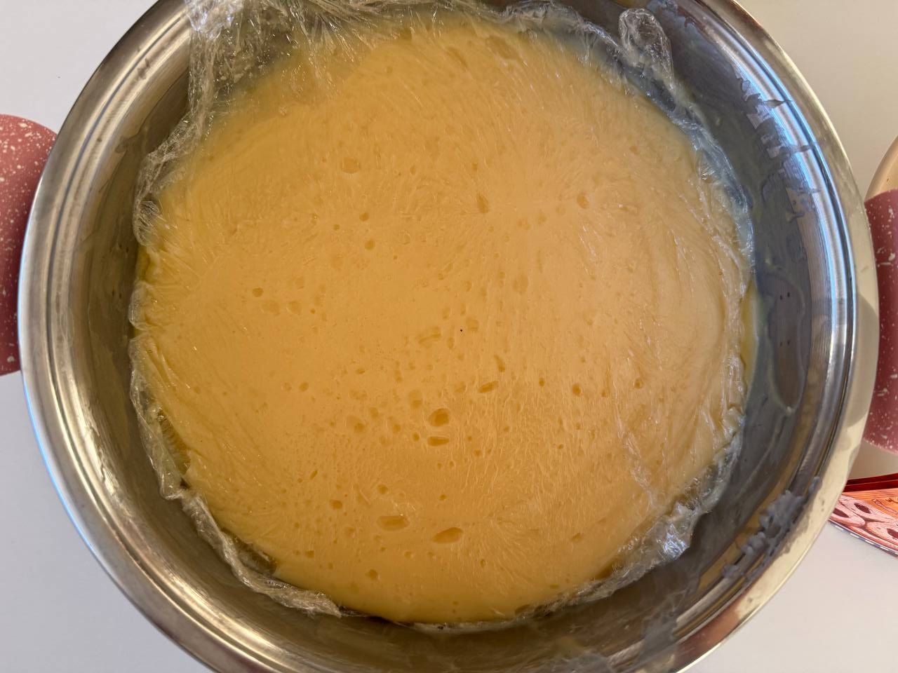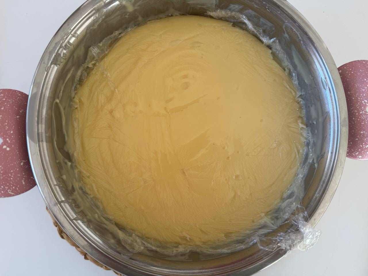 • Сразу накрыть крем пищевой плёнкой в контакт с кремом. Это важно, иначе заварной крем быстро заветрится и сверху образуется корочка, которая не подойдет для сборки торта.
