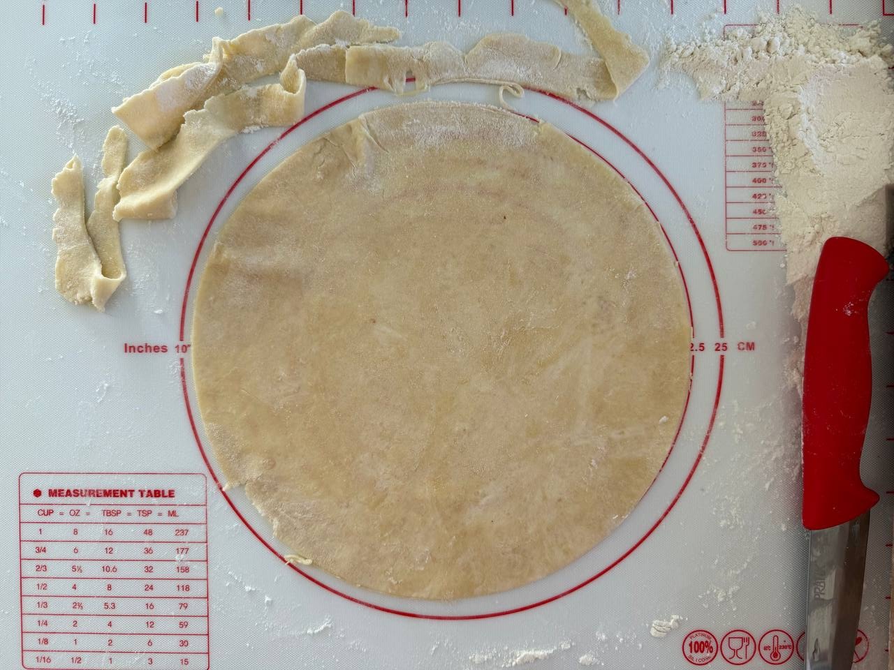 • Поскольку готовые коржи будет очень сложно обрезать, лучше это сделать до выпекания. Положите тарелку или крышку нужного диаметра на корж и надавите, чтобы остался отпечаток. Затем срежьте лишнее ножом. Обрезки не выбрасывайте, мы их будем использовать для украшения торта.