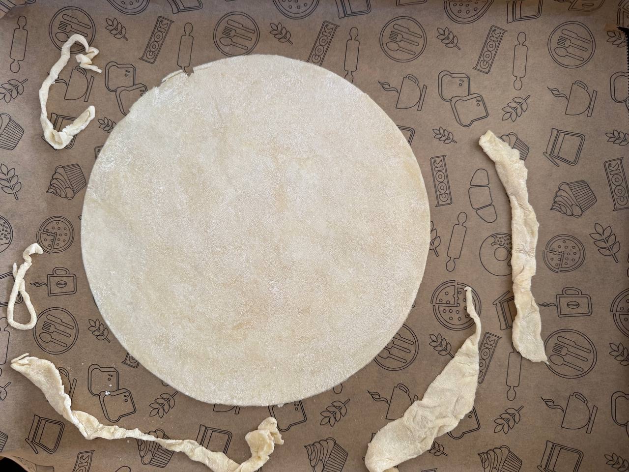 • Готовый корж переложить на пергамент, обрезки разложить вокруг коржа. Выпекать в течение 10 минут на режиме верх/низ, без конвекции, на средней полке, до золотистого цвета.
