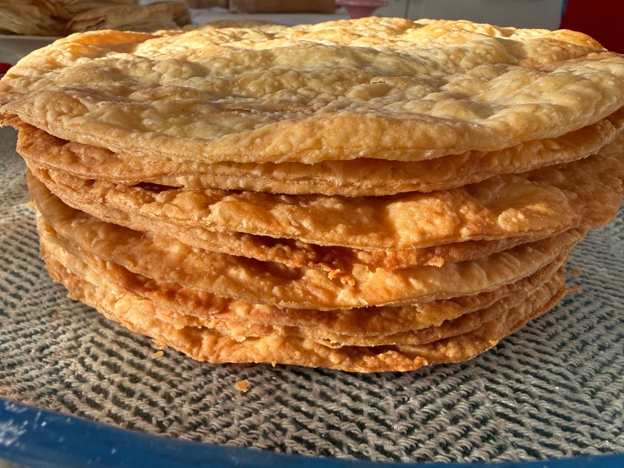 • Положить первый шарик на присыпанную мукой поверхность и раскатать очень тонко, не больше 1–2 мм. Диаметр коржа должен получиться около 23-25 см.