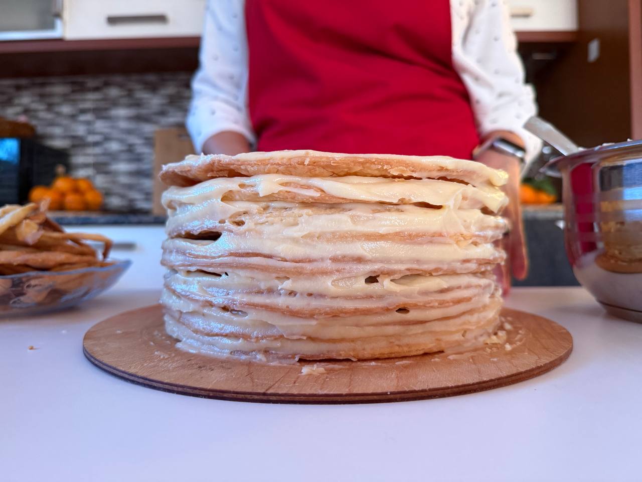 • Третий корж положить гладкой стороной вниз и также промазать кремом. Дальше продолжить выкладывать коржи, чередуя стороны. Это нужно для того, чтобы Наполеон получился более ровным, а между коржами не оставалось ненужного воздушного пространства. Сверху должна оказаться гладкая сторона.
