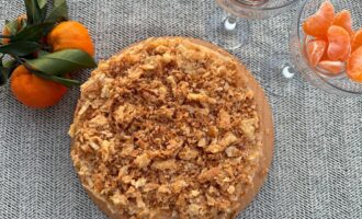 • Обсыпать торт Наполеон со всех крошкой, она будет легко прилипать к заварному крему. По желанию можно дополнительно украсить Наполеон ягодами или другим декором.