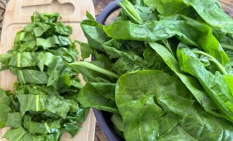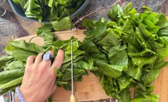 Листья мангольда или шпината тщательно промыть, обсушить и удалить жесткий стебель.