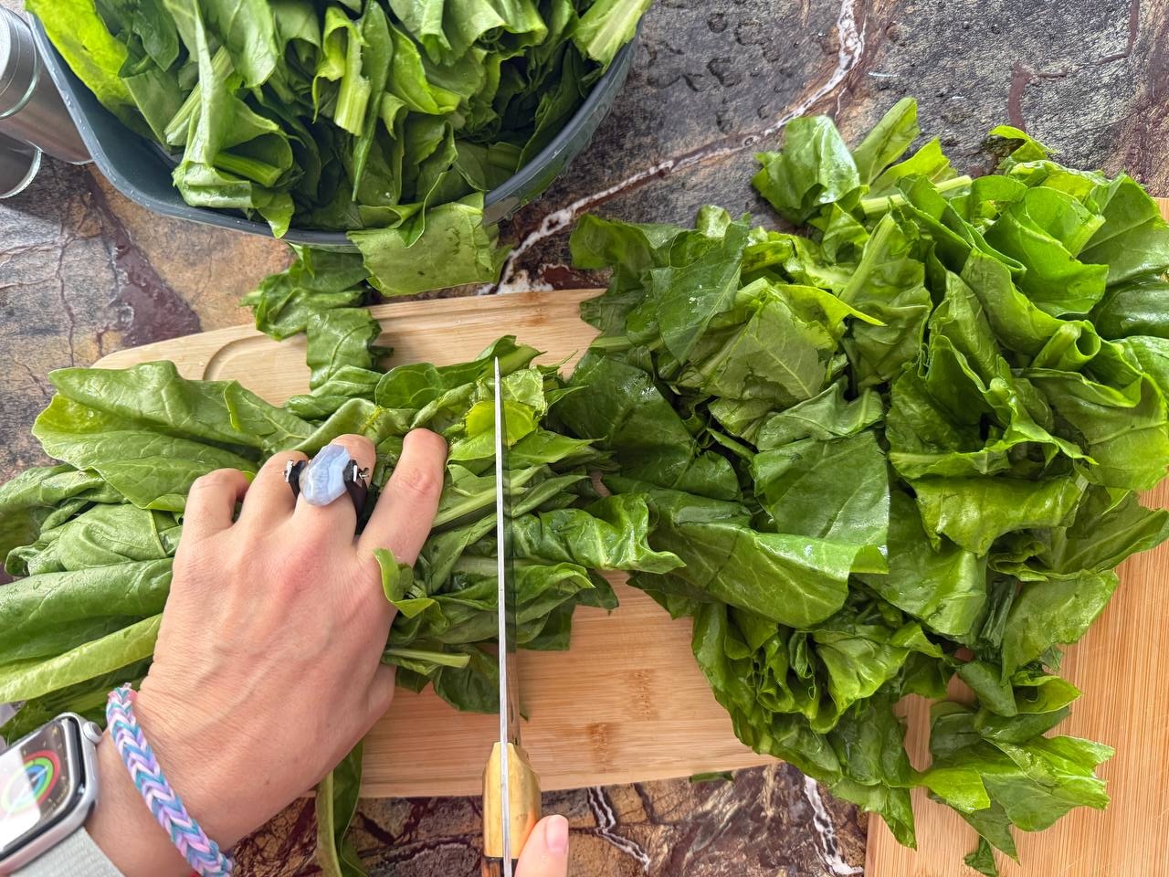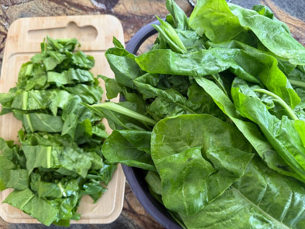 Довольно грубо нарезать листья. Это нужно для того, чтобы их удобнее было обжаривать.