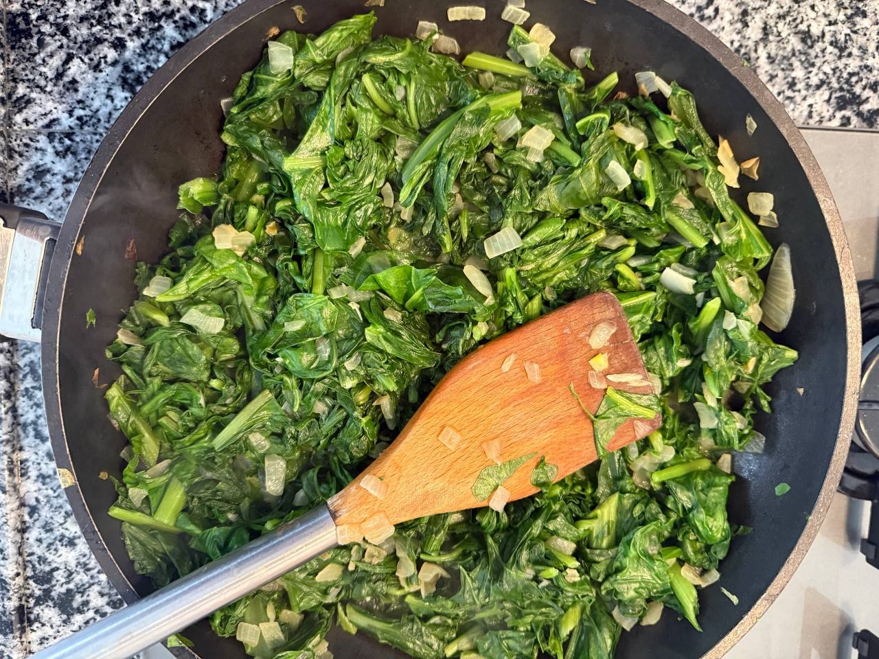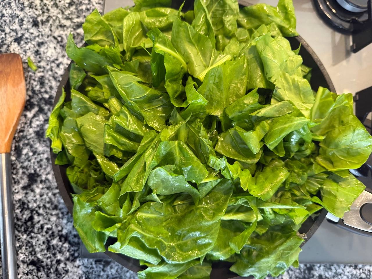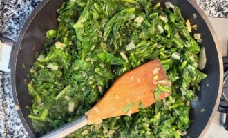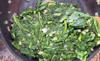 Партиями добавлять листья мангольда или шпината. Сначала они будут занимать в сковороде очень много места, но быстро уменьшаться в объеме.