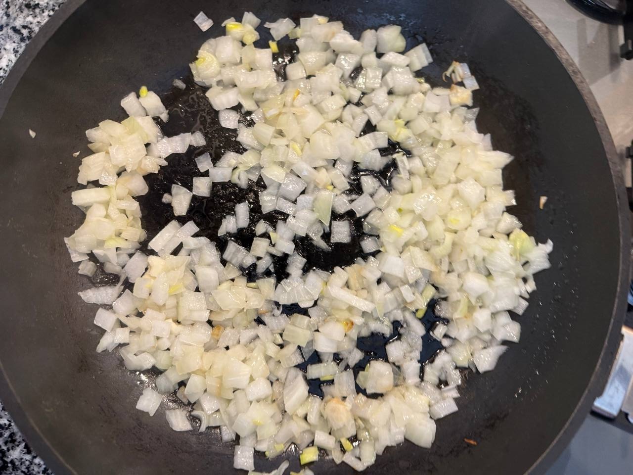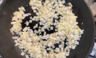 В сковороде разогреть 2 ст. ложки растительного масла. Добавить мелко нарезанный лук и измельченный чеснок. Жарить в течение нескольких минут до легкого золотистого цвета.