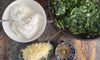 В глубокой миске соединить листья, рикотту, тертый пармезан (или другой твердый сыр), майоран, мускатный орех, молотый черный перец и соль. По желанию также можно добавить одно яйцо. Хорошо перемешать и отложить начинку в сторону.