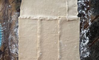 На дно формы выложить пласт теста так, чтобы оно чуть свисало с бортиков. Если у вас пласты слоеного теста небольшие, можно их соединить чуть внахлест и раскатать скалкой до получения нужного размера.