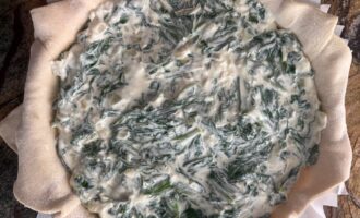Сверху выложить начинку, равномерно распределив ее по всей поверхности.