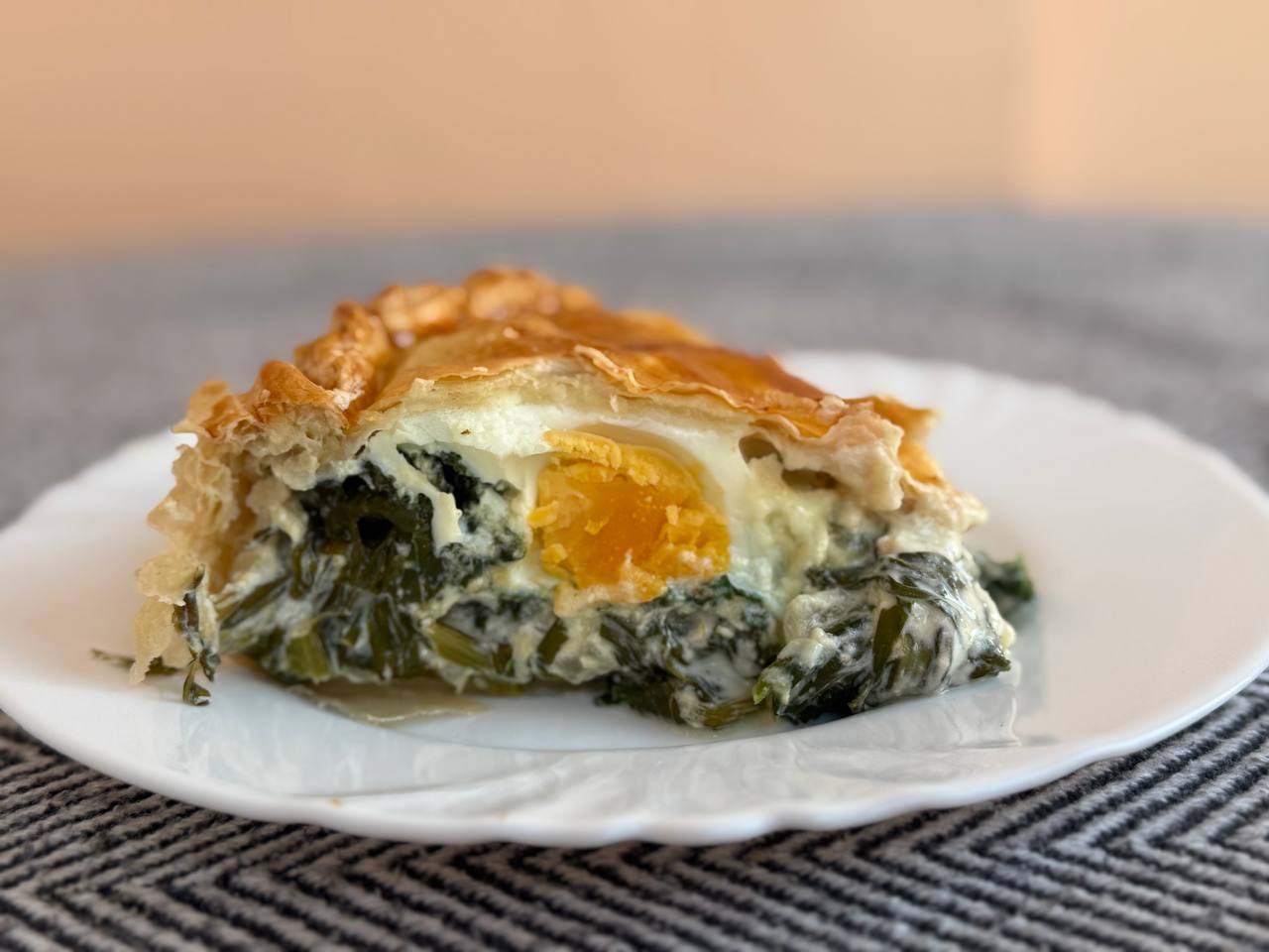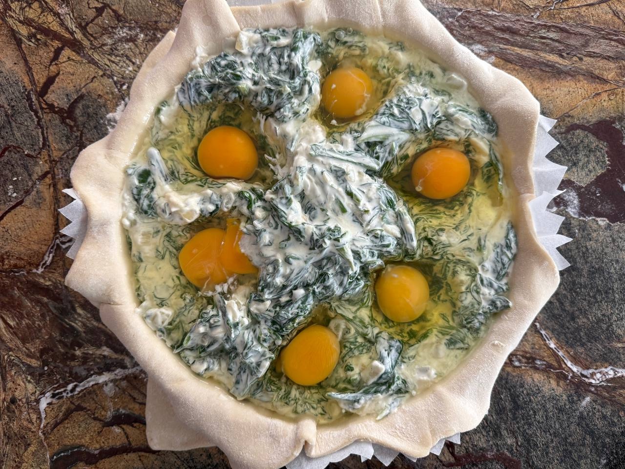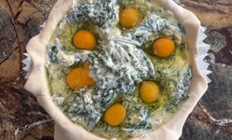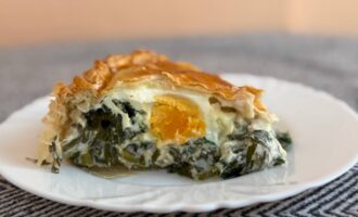 Нарезать готовую паскуалину на порционные куски так, чтобы разрез приходился по середину каждого яйца. Тогда разрез пирога будет очень красивым. Приятного аппетита!