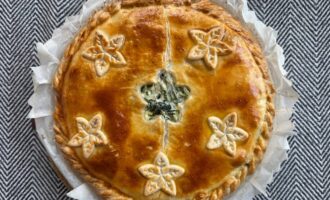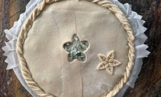 Защипнуть края по периметру пирога, при необходимости срезав излишки теста. В центре пирога сделать небольшое отверстие для выхода пара.
