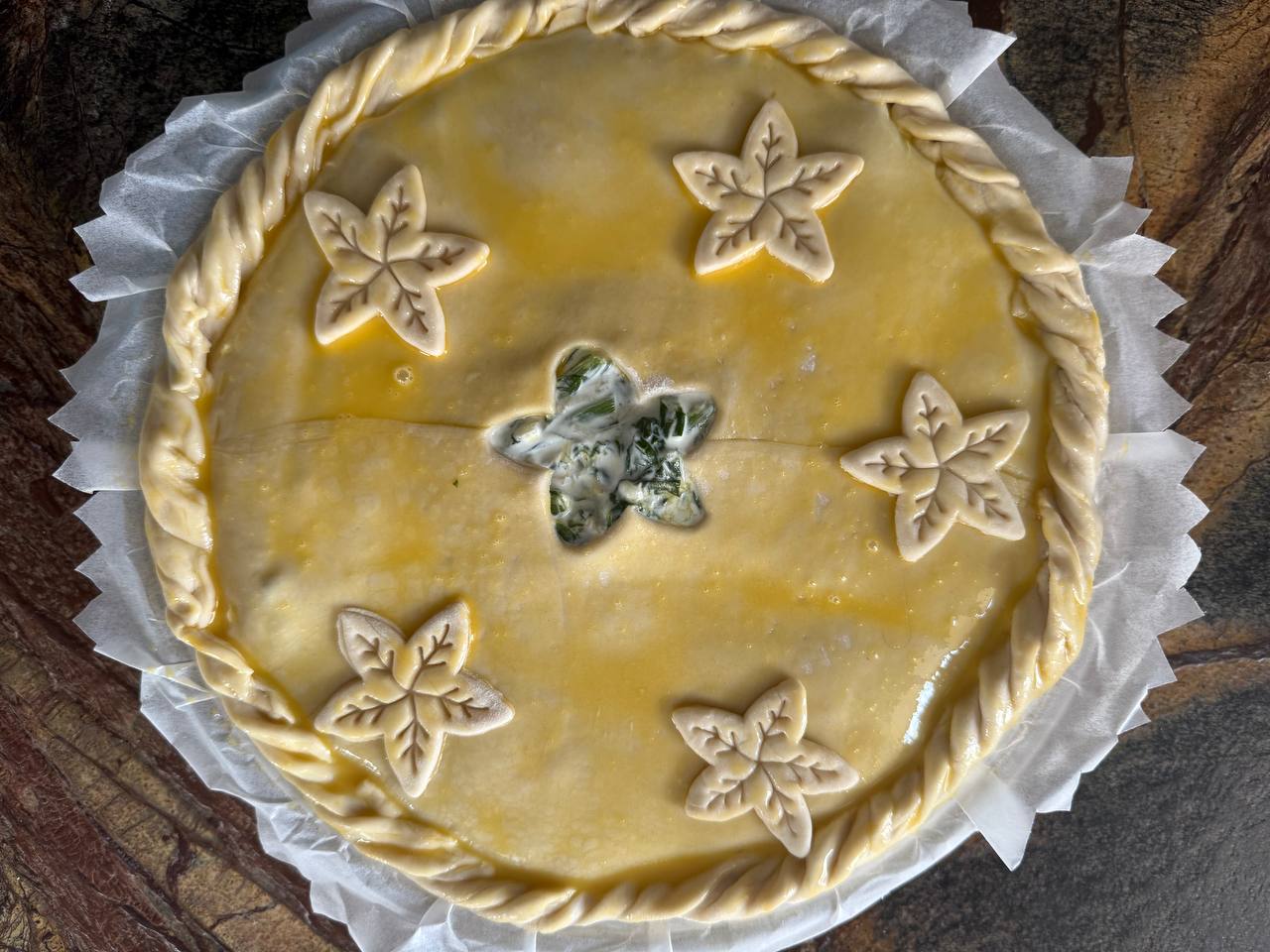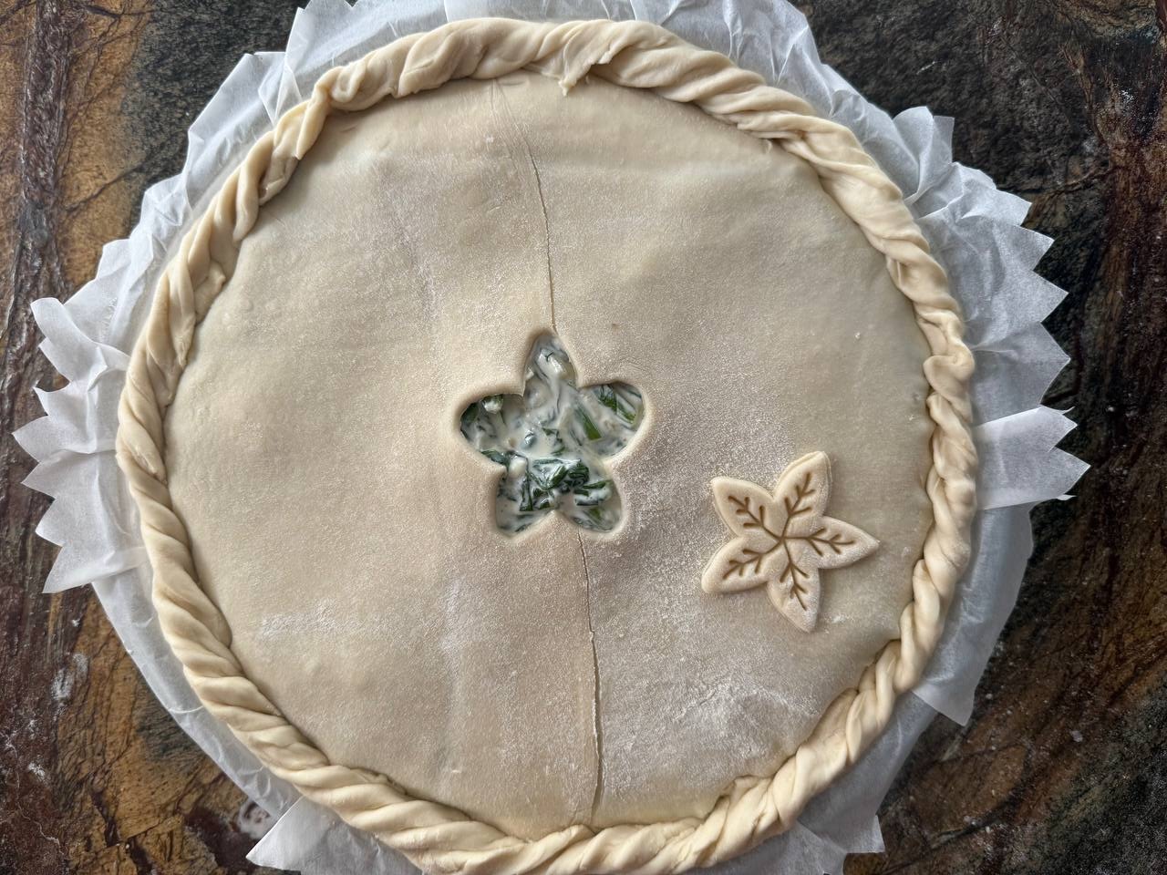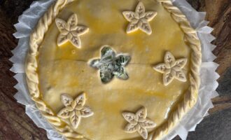 Смазать верхнюю поверхность пирога желтком, смешанным с 1 ч. ложкой молока. При желании можно украсить паскуалину вырезанными из остатками теста фигурками. Для этих целей отдично подойдут формы для печенья.