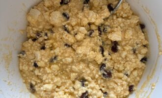 • Запарить изюм кипятком на 5 минут, затем обсушить и добавить к творожной массе (по желанию).