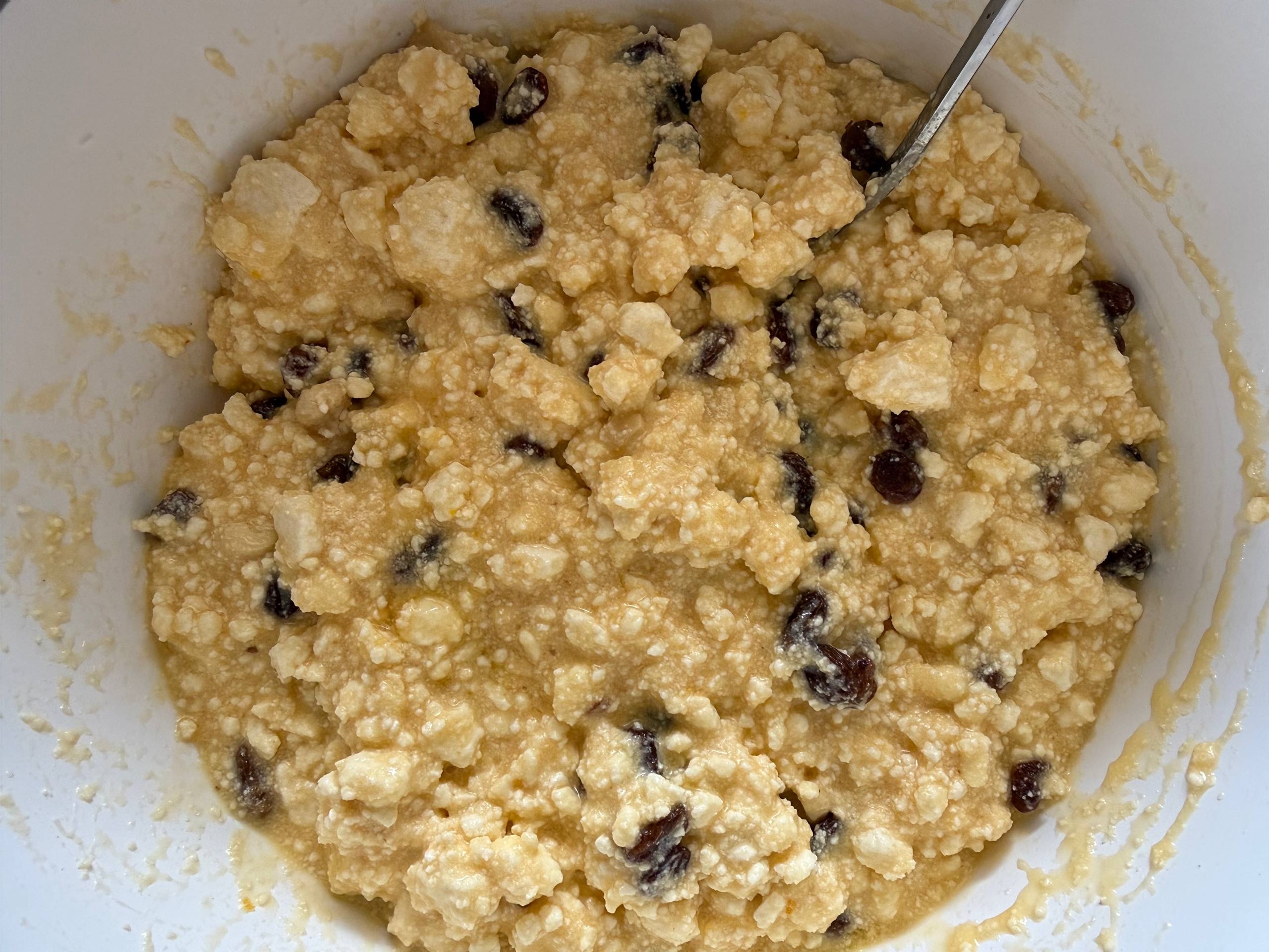 • Запарить изюм кипятком на 5 минут, затем обсушить и добавить к творожной массе (по желанию).