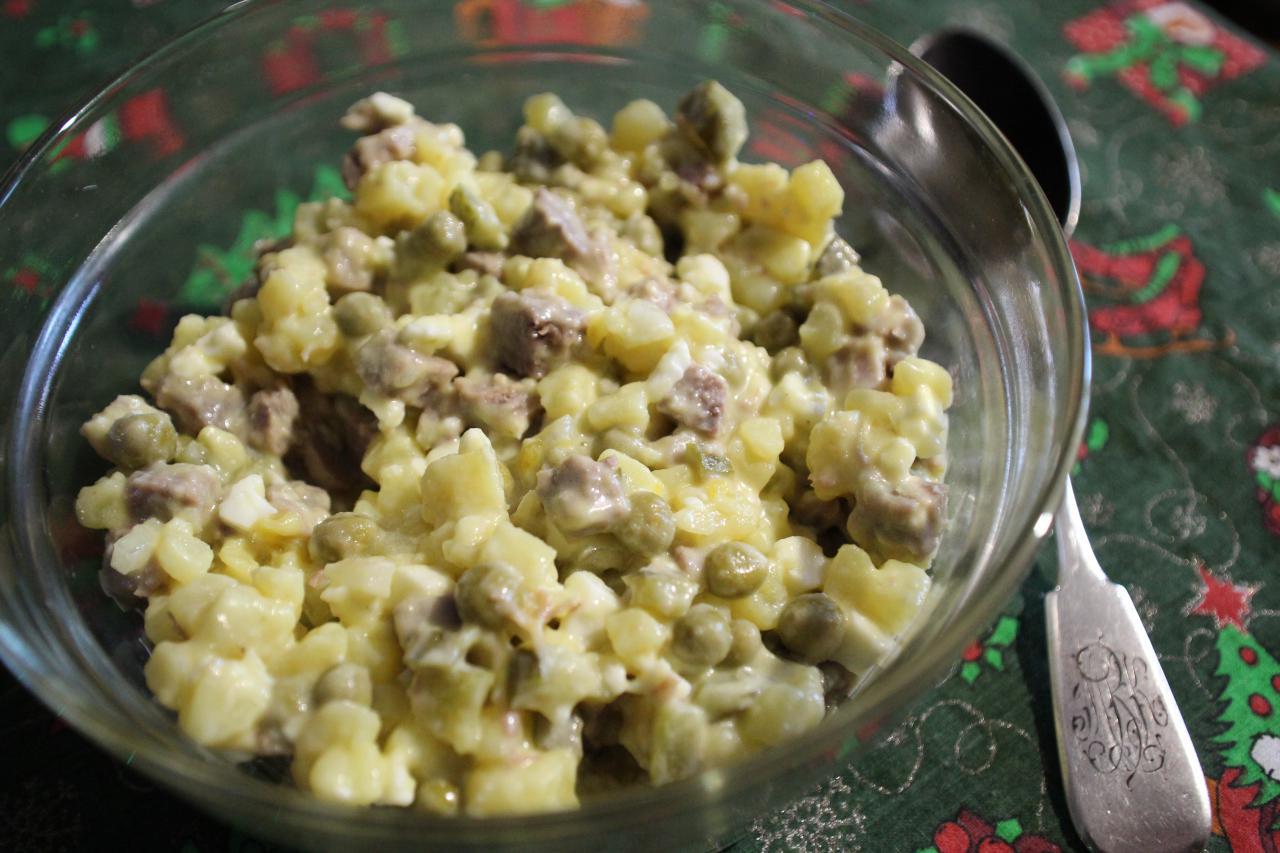В качестве мясного компонента используется отварная говядина. В альтернативных вариантах допускается замена на варёную колбасу, ветчину или курицу.